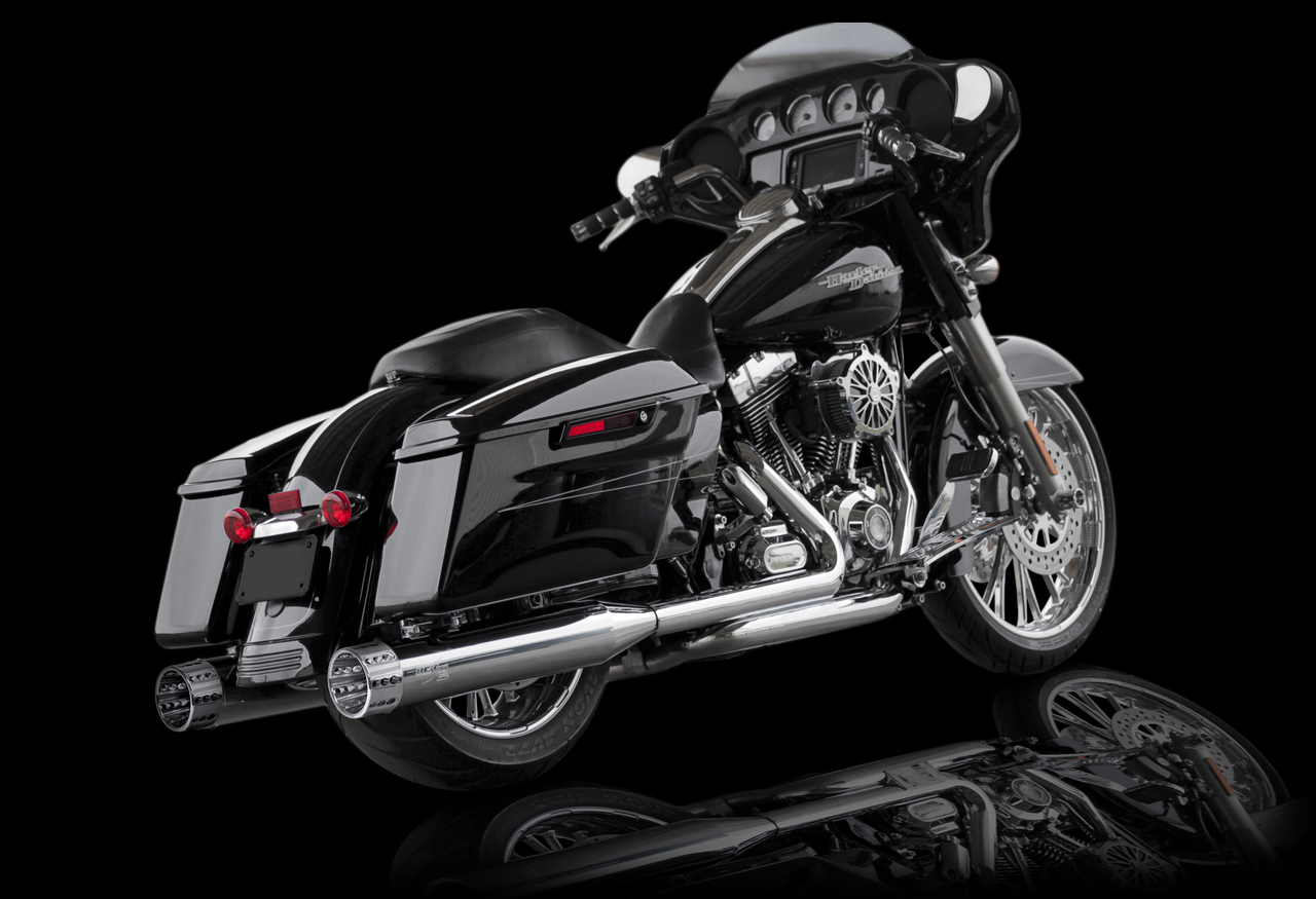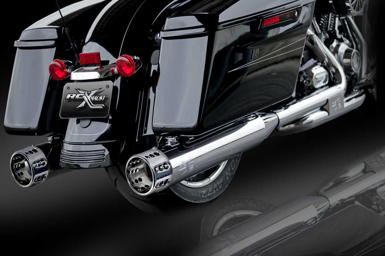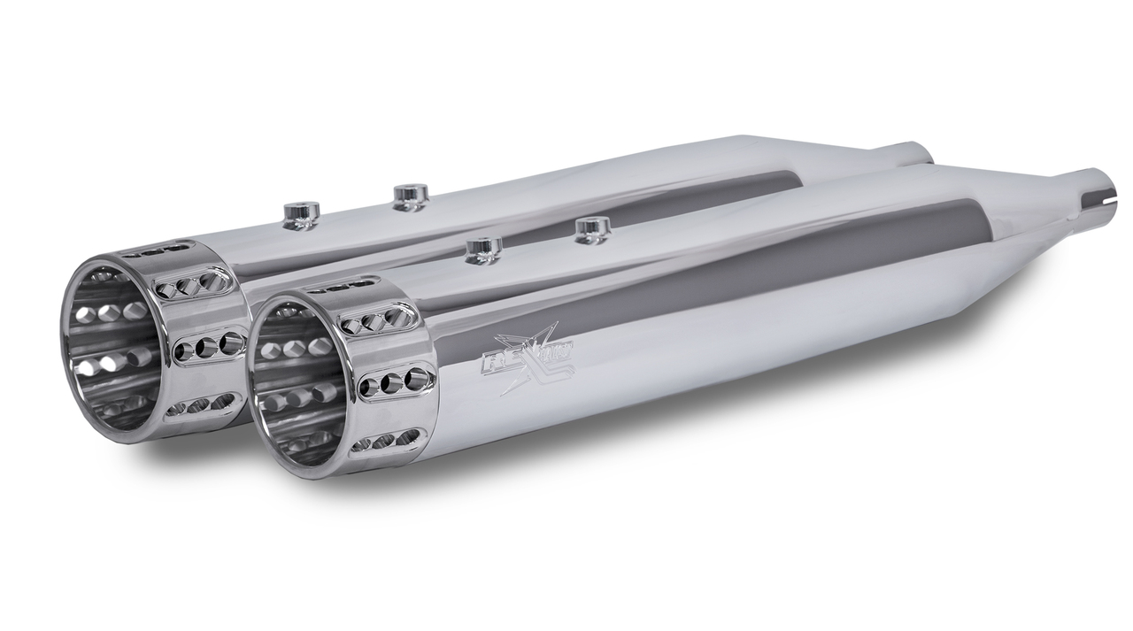 RCX Exhaust 4.5" Slip-on Mufflers, Chrome with Gatlin Chrome Tips. The RCX 4.5" mufflers are truly unique in design while offering an incredibly deep and smooth exhaust tone. Each muffler features a full length 4.5" diameter muffler body with a precision tuned 3 inch stepped core baffle. This unique baffle design transitions from a 2.5 inch louvered core into a ceramic wrapped 3 inch perforated baffle, which works to produce a deep smooth rumble while providing you with increased horsepower and torque.