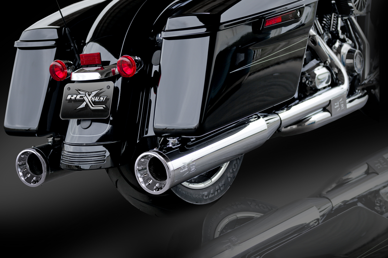 RCX Exhaust 4.5" Slip-on Mufflers, Chrome with Torx Chrome Tips. The RCX 4.5" mufflers are truly unique in design while offering an incredibly deep and smooth exhaust tone. Each muffler features a full length 4.5" diameter muffler body with a precision tuned 3 inch stepped core baffle. This unique baffle design transitions from a 2.5 inch louvered core into a ceramic wrapped 3 inch perforated baffle, which works to produce a deep smooth rumble while providing you with increased horsepower and torque.